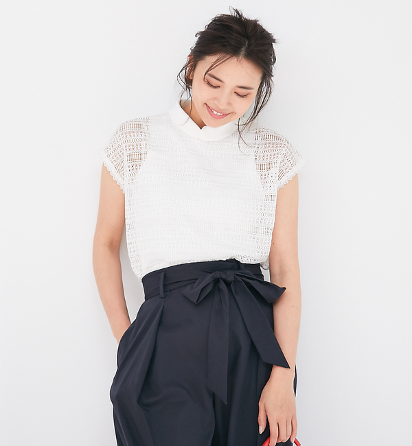 【送料無料】 贅沢な総レースにニットインナーをドッキングしたトップス。インナーを別で用意しなくても1枚で着られるのが嬉しいポイント。繊細なレースながらボーダーに編んであるので、甘くなりすぎずパンツスタイルにもマッチ。model:H166・B80・W58・H82 着用サイズ:FREE カリテ/qualite qualite|トップス|シャツ・ブラウス